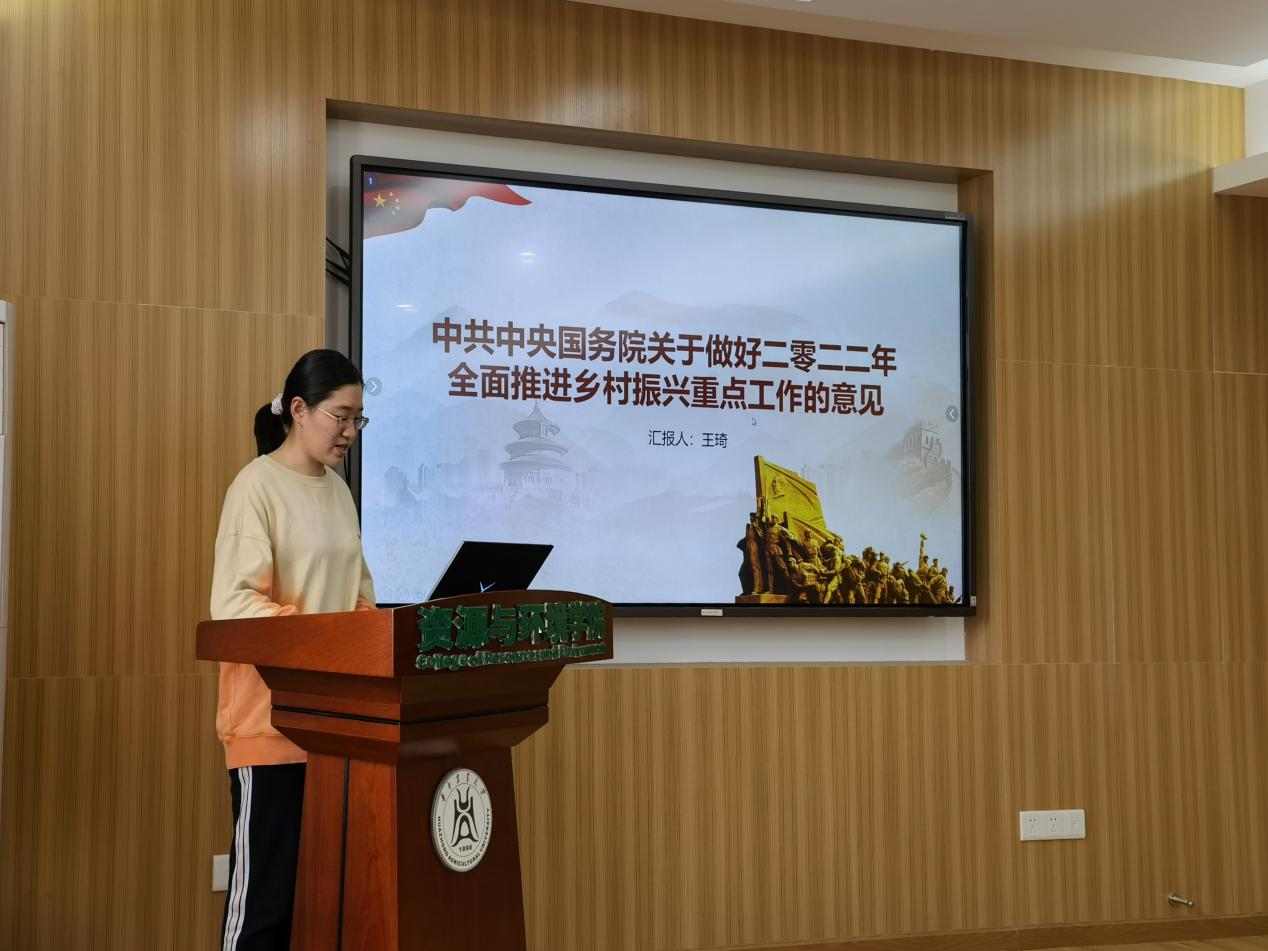 之后,王琦同志领学了中共中央国务院关于做好二零二二年全面推进乡村振兴重点工作的意见。她介绍了意见中明确的两条底线任务和 三方面重点工作,以及推动实现“两新”,同时总结了意见的重要意义。她谈到:致天下之治者在人才,成天下之才者在教化,人才振兴实施正确方向是实现乡村稳、农业兴的重要因素。我们作为青年党员,作为91直播 的一名学生,要坚持以习近平新时代中国特色社会主义思想为指导,深入贯彻党的十九大和十九届历次全会精神,努力提高自身综合素质,为乡村振兴保驾护航。