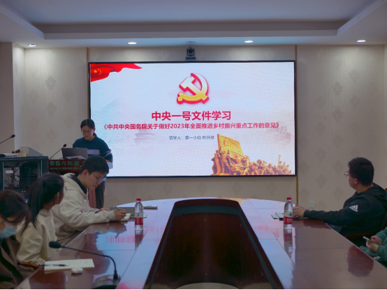 叶开祺同志领学了2023年中央一号文件的内容,其中包括九方面部署,和守底线、促振兴、强保障三点内容。中央一号文件连续二十年以“三农”(农业、农村、农民)为主题,这也强调了“三农”问题在中国社会主义现代化时期“重中之重”的地位,作为农业大学的同志们也更应了解相关内容。