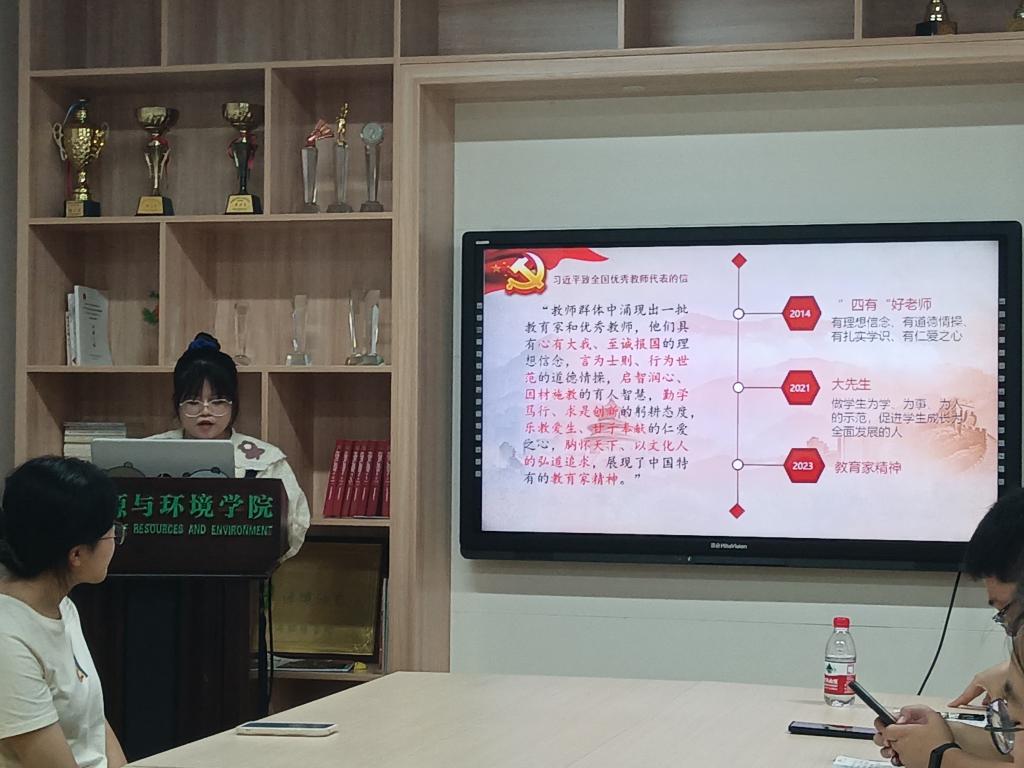 温颖馨同志带领大家学习了习近平致全国优秀教师代表的信,信件中对广大教师致以问候与祝福,并提到希望全国广大教师以教育家为榜样,大力弘扬教育家精神。牢记为党育人、为国育才的初心使命,树立“躬耕教坛、强国有我”的志向和抱负,自信自强、踔厉奋发,为强国建设、民族复兴伟业作出新的更大贡献。