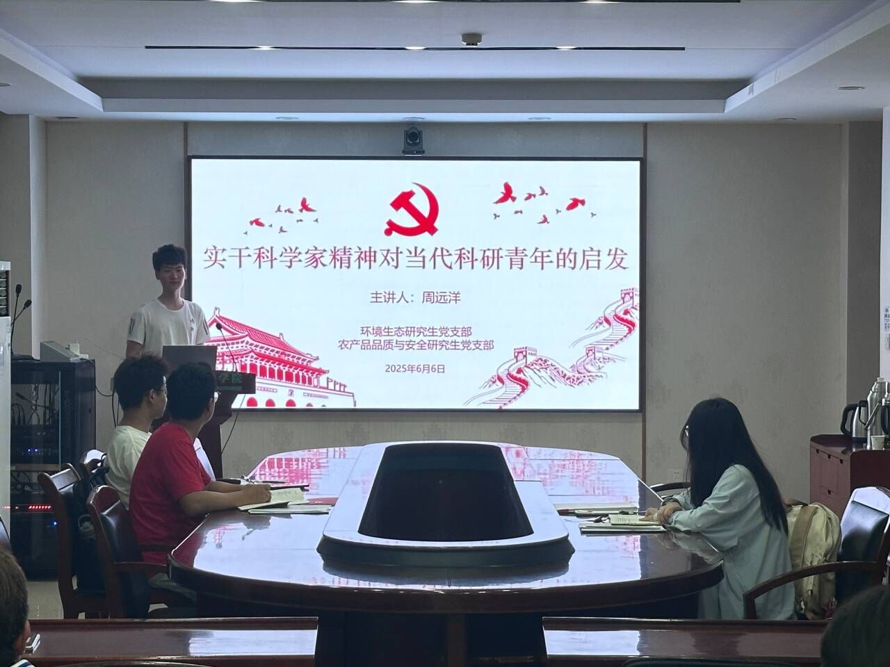 6月6日,环境生态研究生党支部和农产品品质与安全研究生党支部在91直播 楼204会议室联合开展学习活动,校研究生宣讲团成员周远洋受邀作“实干科学家精神对当代科研青年的启发”专题宣讲。