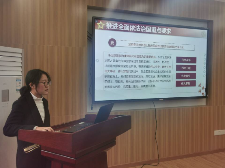 陈欢同志以“奋进新征程,法治筑根基”为主题带领大家学习了习近平总书记法治思想以及宪法精神。让在场党员同志了解到习近平总书记着重强调的五个方面工作以及十一个工作要求,以及贯彻落实习近平总书记法治思想要深刻把握其政治性、人民性、系统性、实践性。在谈及弘扬宪法精神,坚定宪法自信时,陈欢同志这样说道:“从坚定社会主义道路、制度、理论、文化上来坚定宪法自信,在日常的生活学习中守法、知法、懂法。”