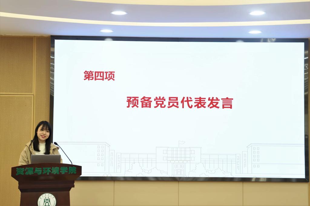 土壤化学与环境研究生党支部倪春兰作为博士生预备党员代表发言,她提到每位预备党员都应该不断提升思想政治修养,始终保持实事求是、与时俱进的精神状态,始终坚持全心全意为人民服务的根本宗旨,不断增强自身在专业领域的本领,积极努力为社会做出应有贡献。