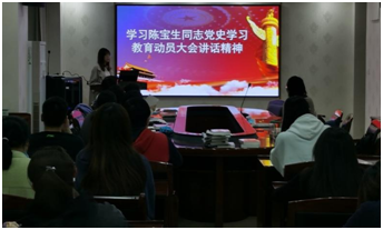 随后,陈雪双同志领学陈宝生通知党史学习教育动员大会讲话精神,她讲到,通过学党史,要真正做到干实事,解难事,谋大事,创新事,长本事,并且希望党员能在学习党史中思考“马克思主义为什么能行”、“中国共产党为什么能行”这两个问题。