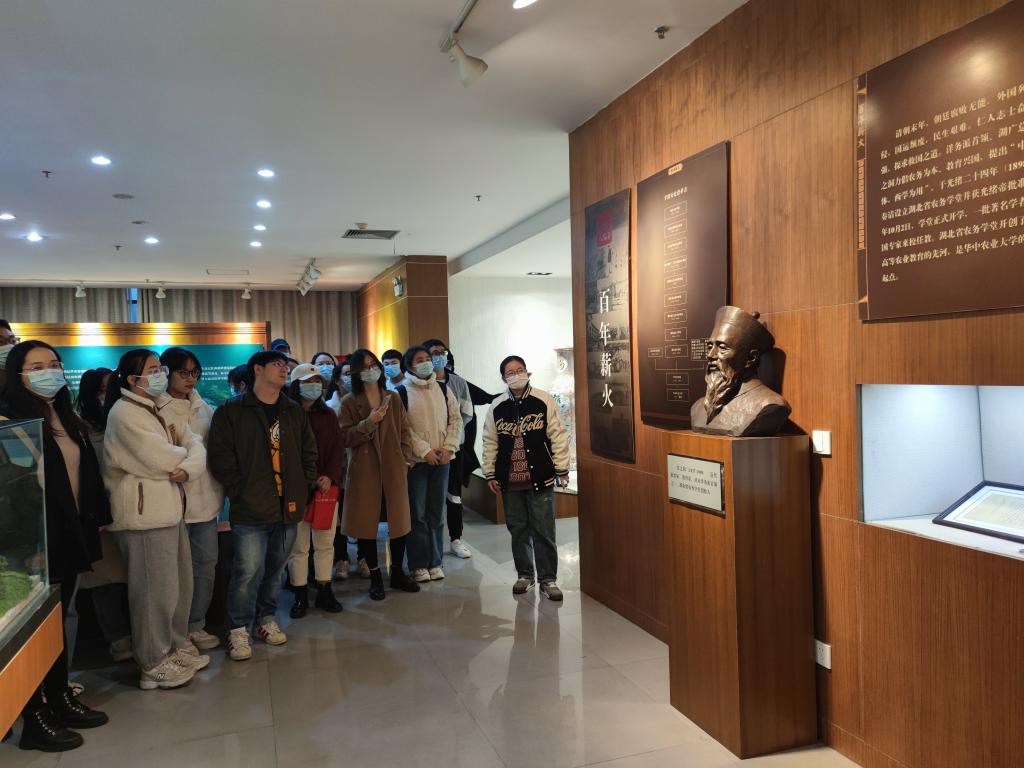 校史陈列馆于2006年5月建成,位于新图书馆一层,校史馆左右门柱上悬挂着一副楹联:“凡民俊秀皆入学,天下大利必归农”,这是湖北农务学堂开学时,创始人张之洞先生题写,它指引着华农人奋发向上,积极进取。“民以食为天,食以农为先”彰显了农学在人类发展过程中独一无二的地位,它必将影响一个国家、一个民族的长远发展。全体党员同志由此开始探索学校的悠久历史。