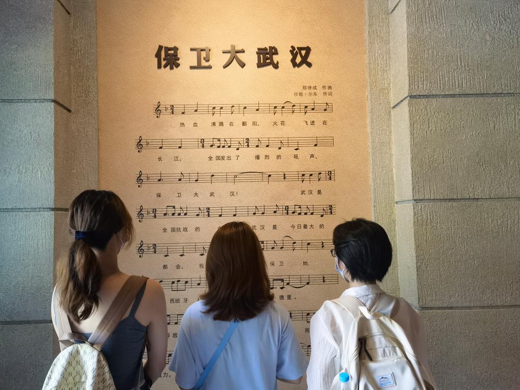 随后小组来到了八路军武汉办事处纪念馆,这里是为八路军、新四军筹备粮饷和各种军需物资、开展宣传工作。小组成员们沿着馆内通道参观历史遗迹,学习先烈们的英勇事迹,然后在先烈们的雕像面前停下了脚步,成员们向着雕像行注目礼,随后深深鞠了一躬。最后到了印有《保卫大武汉》乐谱的地方,成员余小艺在此教其他成员唱这首歌,深切体会了当时先辈们保卫武汉时坚定的决心以及壮志豪情。