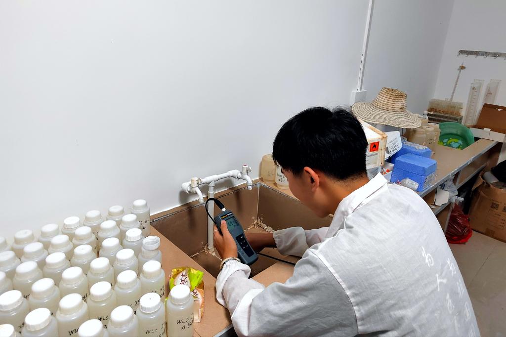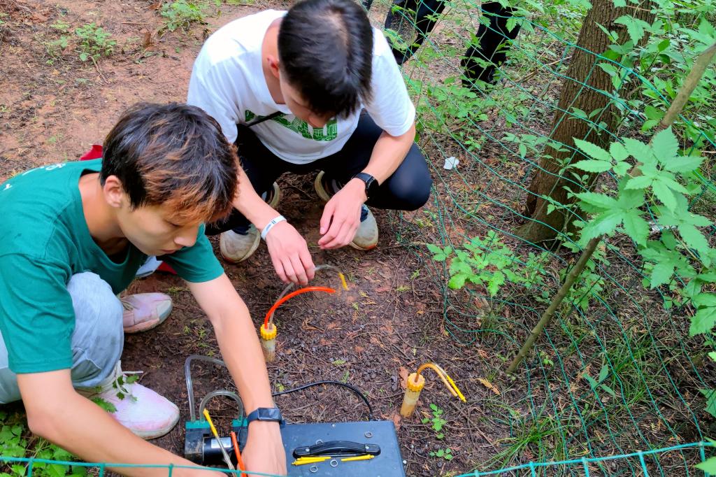 需要采样的点均匀地分布在五龙池河流流域,这种采样点的布设方法使得采集到的数据更具代表性。每个采样点设置了三个用于采样的管子,分别能够采取到地下15cm、30cm、60cm的土壤含水量。可以通过电脑将这些数据现场导出,及时地分析该采样点的土壤含水量。在采集完这些数据后,黄一鸣问道:“通过这些数据能够说明什么?”在经过队长与队员间的仔细对比之后,得出五龙池一带的土壤水含量在20%-50%左右。这些土壤水含量也与季节息息相关,在夏季汛期土壤水含量会很高,在其它季节会略有下降。在采样点除了要收集这些数据外,还要对设备电池电量的检查。每天晚上,还要在监测站实验室对所采样的土壤溶液进行DO(溶解氧)指标的监测。10日早上,团队成员考虑到接下来的雨水天气,再次来到15个采样点对采样管进行抽气工作。在抽完气后管子内会形成负压,这是土壤水渗透进管道以便后续进行土壤溶液提取的必要条件。