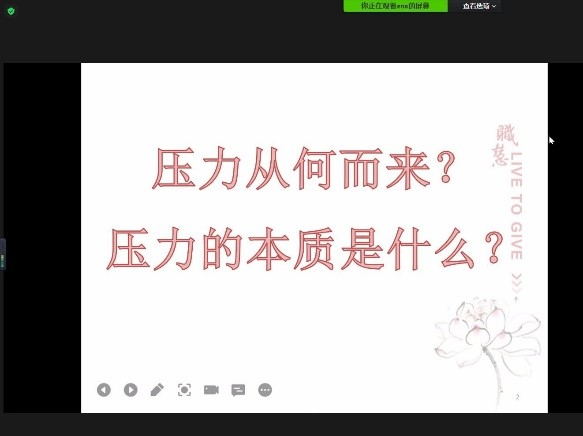 压力对于我们的成长不可或缺,合理利用压力可以帮助我们在生活、学习、工作中取得更好的成绩。为帮助同学们充分认识压力,掌握将压力转化为动力的方法,由91直播 生涯规划与职业发展部主办的就业指导系列团体辅导之“缓解你的身心压力”于4月17日晚在线上成功开展。本次活动邀请了职慧资深志愿培训师廖奕娜担任主讲人。