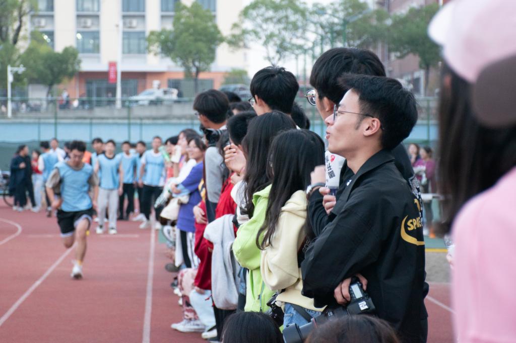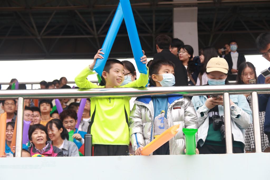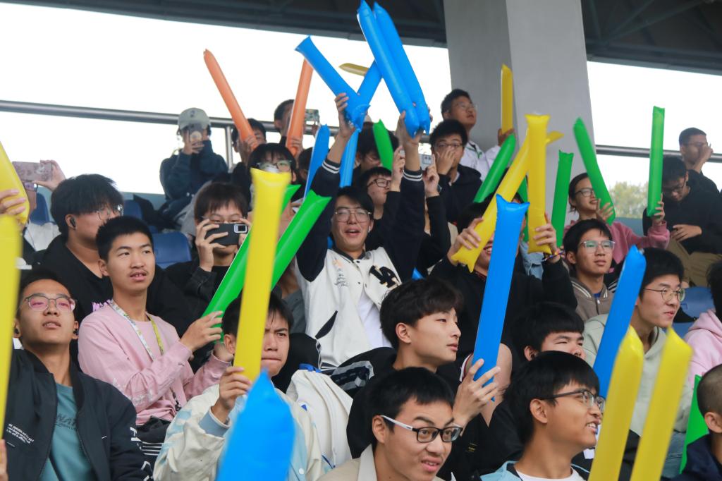 运动会现场观众热情洋溢,摇旗呐喊,为运动员加油助威,洪亮、整齐划一的声音在观众席上不断响彻。
