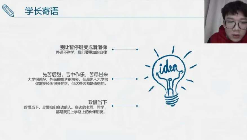 22日上午,课堂如期进行。在聊到课堂情况时,让袁浩感触最深的就是学弟学妹们的求知欲和对未来生活的期待。“有一个高三学生被学习成绩所困扰,我了解到情况之后便对他说,其实瓶颈期很正常,踏踏实实的走好每一步,相信自己,用实际行动来激励自己,成绩一定会有提升的。”在疫情期间,许多高三学生的学习生活被打乱,自身的学习压力可想而知。面对疫情,袁浩也不忘提醒学弟学妹们抓好自己的学习,他说:“在疫情期间也不能放松,要认真对待学校安排的学习任务,在家更要养成良好习惯,控制好自己。”袁浩希望这样的志愿课堂能让同学们调整好自己的心态,并以更好的姿态去迎接疫情下的学习任务。