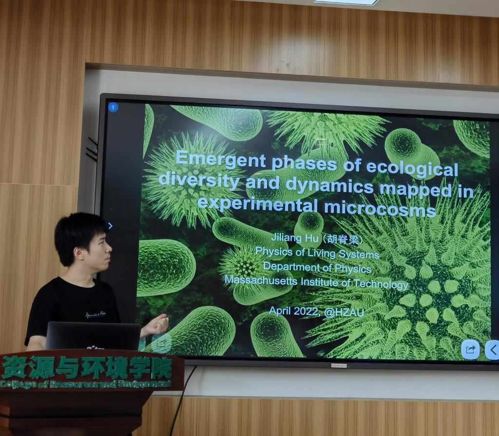 4月26日,应高春辉副研究员邀请,美国麻省理工91直播 (MIT)胡脊梁博士生来校进行学术交流。此次学术交流活动是2021年91直播 举办的“生物膜多尺度界面过程与土壤健康国际研讨会”的延续,旨在加强双方在科研合作、学术交流、人才培养等领域的全面合作。农业微生物学国家重点实验室副主任黄巧云教授、91直播 91直播 院长谭文峰教授、副院长蔡鹏教授等出席报告会,土壤与植物营养系和生态学系部分青年教师及研究生参加交流活动。
