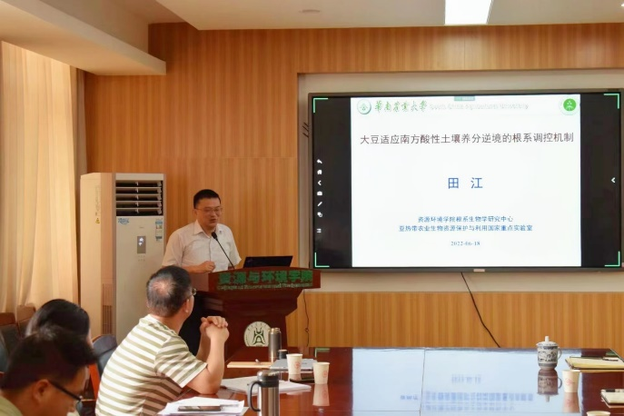 6月18日上午,华南农业大学资源环境91直播 副院长、亚热带农业生物资源保护与利用国家重点实验室课题组长、根系生物学研究中心田江研究员和91直播 植物科学技术91直播 杨万能教授应91直播 丁广大教授邀请参加第16期资源与环境青年创新前沿论坛,与华农师生一起探讨了南方酸性土壤中大豆适应养分逆境的根系调控机制和作物表型组技术方面的最新研究进展。论坛由丁广大教授主持。