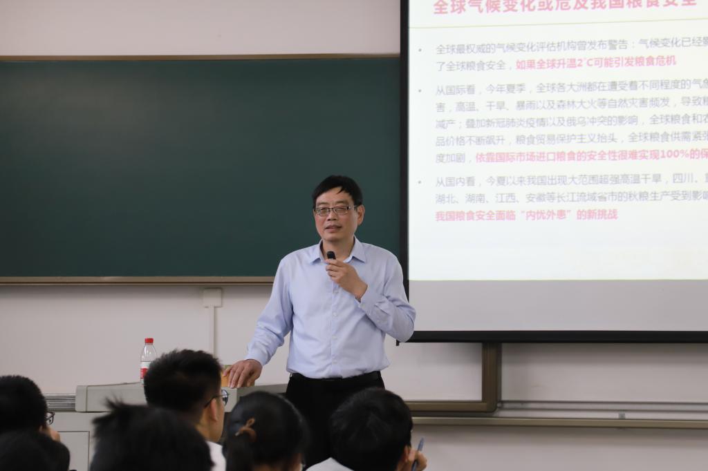 我国粮食连续18年丰产,一号文件为何还强调“粮食安全”?结合《世界粮食安全和营养状况》报告,郭刚奇向同学们重点解释了如今世界面临的问题,战胜饥饿只是问题的一部分,全球饥饿人口增加,营养目标受挫,全球消除饥饿、粮食安全和营养不良等工作所面临的挑战正不断加剧。粮食是国家安定的“压舱石”,人民幸福的“稳定器”,全球博弈的“杀手锏”,郭刚奇从“俄乌冲突”的系列影响展开,从全球视野着眼中国发展,中长期看中国粮食供求仍将处于紧平衡态势,同时,农业种质资源对外国的依赖性依然存在,面临生物编谱技术专利等“卡脖子”问题。