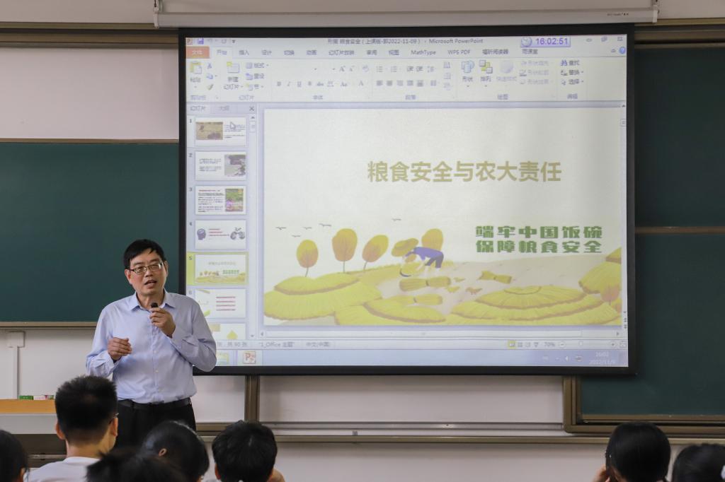 11月9日下午,校党委常委、副校长郭刚奇在第四教学楼A304教室为91直播 环工类2204-2206班讲授《形势与政策》课程,主题为“粮食安全与农大责任—端牢中国饭碗,保障粮食安全”。
