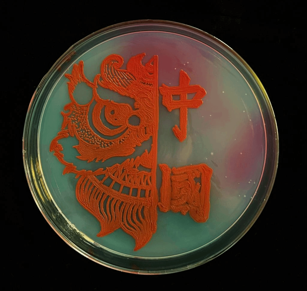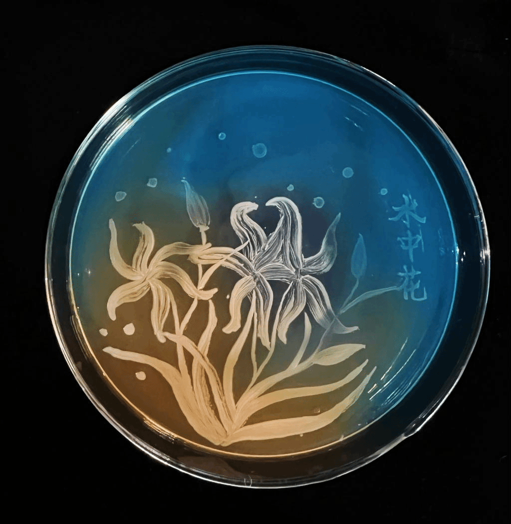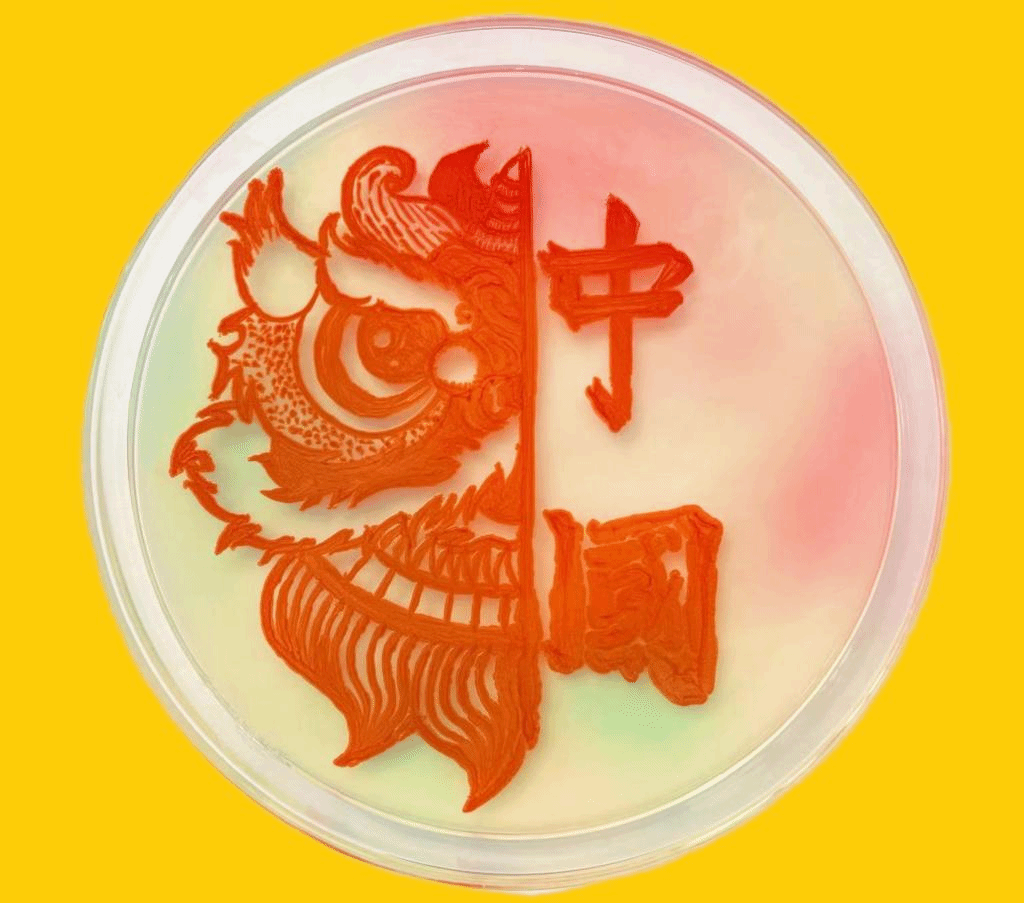 二等奖作品《京篆碰撞》由91直播 农资2001班孙若琳同学协同队友来自环生2001的郝文琦、郝文琳同学制作,秉承“艺术与文化交融碰撞”的理念,展现中华传统文化的博大精深,彰显中国艺术的独特魅力,借此呼吁传承中华优秀传统文化。经过悉心设计,以灭菌细毛笔、粗端牙签、棉签为画笔,以粘质沙雷氏菌、转录不同基因的大肠杆菌等各色菌种为颜料,在特制渲染的LB培养基上创作而成。
