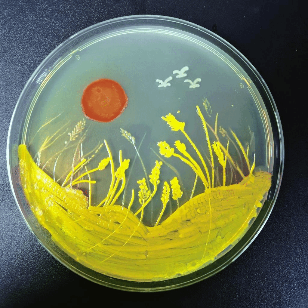 由91直播 农资2002班刘烨、董俊琦、许晶三位同学制作的《麦浪》,创意为“手中有粮,心中不慌”,阳光下茁壮成长的小麦,给人以愉悦与希望。制作过程为培养基的制备、接种与活化:按无菌操作分别将红(Escherichia coli)、黄(Staphylococcus aureus)、橙(Escherichia coli)、白(Bacillus sp.)四种菌种接种到培养基的四个区域。用封口膜将该培养皿密封,放入摇床培养一天。最后按无菌操作,用牙签和棉签蘸取菌液在培养基上进行作画。一共画三个培养基,保证结果的可重复性。
