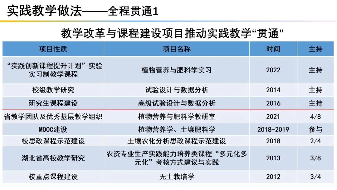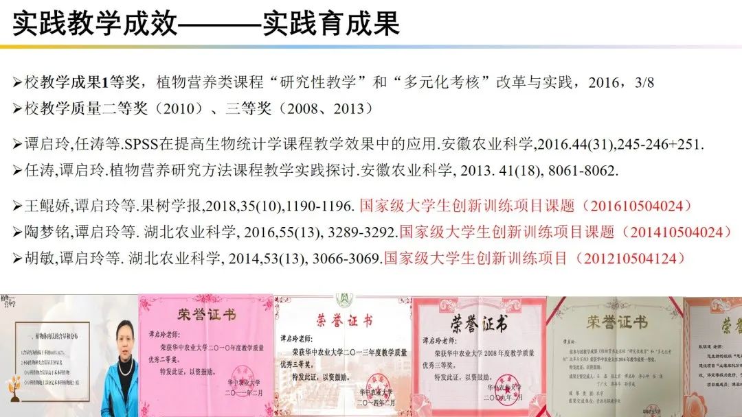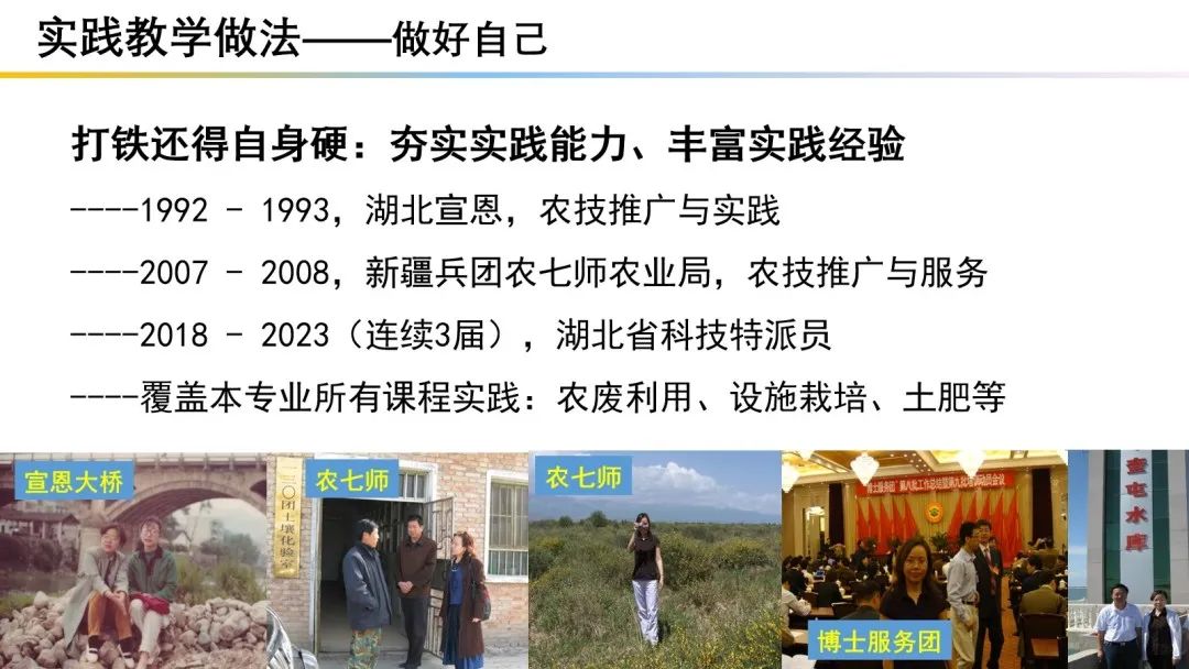谭老师1992—1993年在湖北宣恩进行农技推广与实践;2007—2008年在新疆兵团农七师农业局进行农技推广与服务;2018—2023连续3届在湖北省担任科技特派员;覆盖本专业所有课程实践:农废利用、设施栽培、土肥等。打铁还得自身硬,谭启玲老师多年来不断夯实其实践能力、丰富其实践经验。