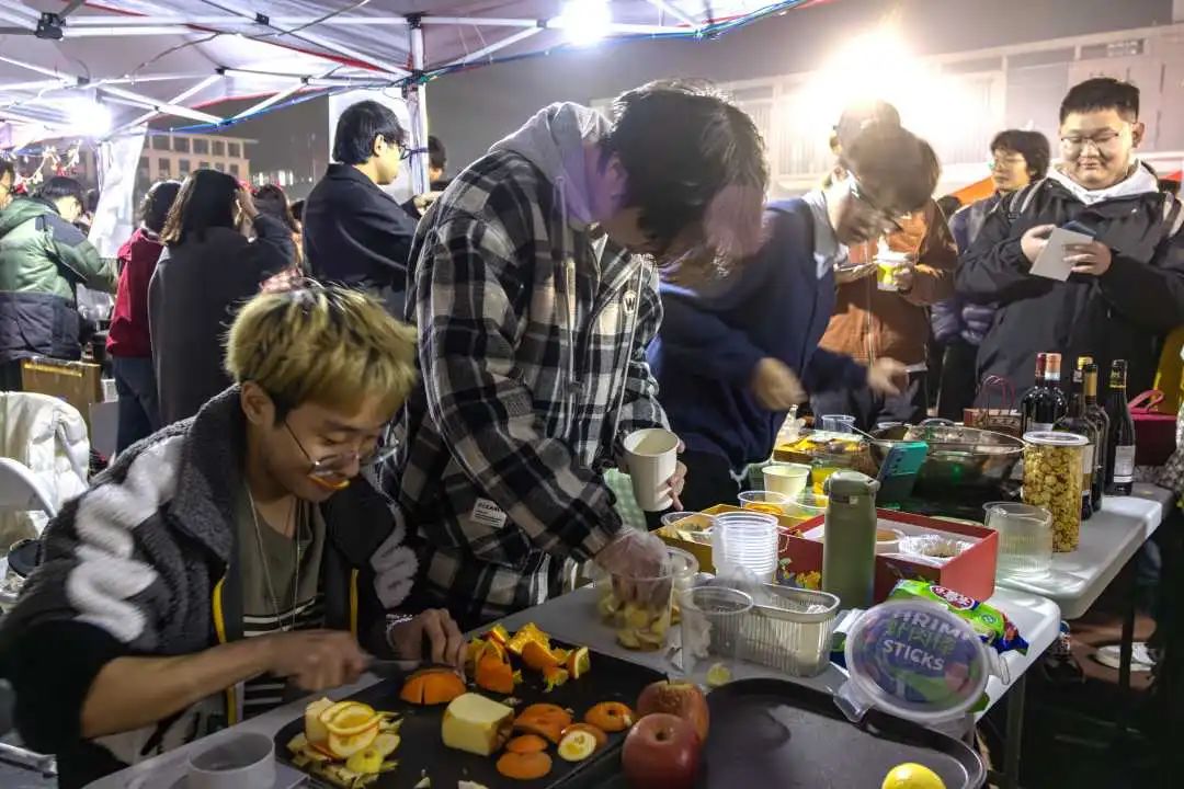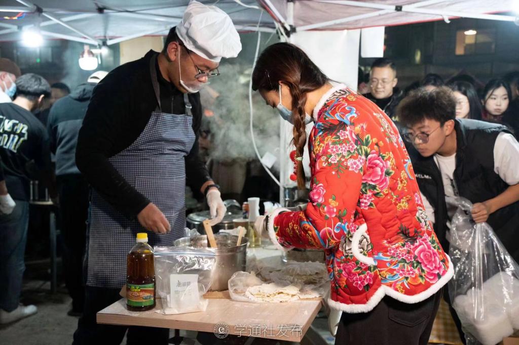恭城“油”礼是什么?路过摊位的同学们甚是好奇。来自广西的负责人陈佳慧介绍到,恭城油茶是广西首个地方特色小吃类产品地理标志证明商标,也是她童年里最温暖的味道。在91直播 副教授徐保东老师的指导下,他们分批次准备了油茶膏等原材料。“都准备好了结果发现缺个电磁炉,徐老师直接把他家里的拿来了”,陈佳慧笑着说,终于和老师一起做出了热腾腾的油茶,配上甜口的麻旦果、酥脆的炸米花和炸花生,一口喝下提神醒脑、温暖身心。