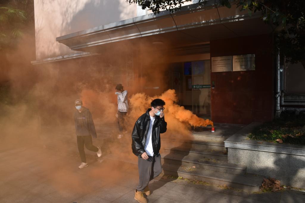 下午16点30分,场景布置组在91直播 楼、五楼位置释放发烟罐。烟雾触发烟感报警装置报警,消控室值班人员迅速查看消防主机显示的着火点,确认火警并疏散大楼人员,将消防联动控制确定在自动状态,并向单位管理人员、校园110进行了电话报告。