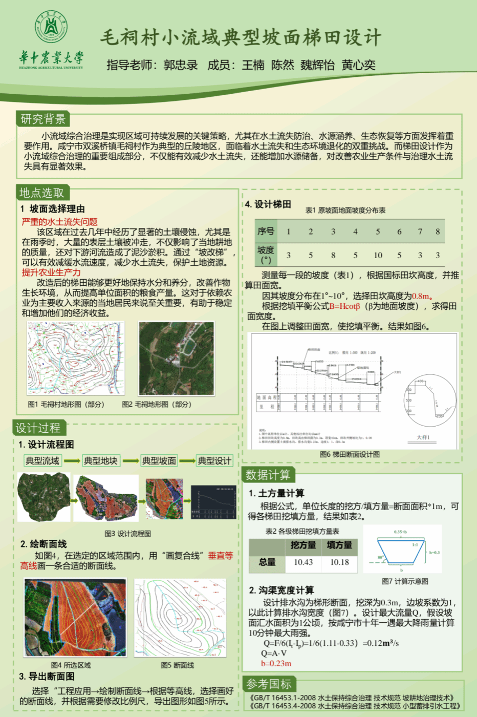 本年度的技能竞赛由环境生态工程专业(水土保持方向)的郭忠录、王军光、宋艳暾、张晓明、魏玉杰、肖海兵担任本年度专业竞赛的指导老师和评委。本次竞赛旨在强化91直播 水土保持方向学生在梯田断面及配套水系设计、土石方量计算及景观配置方面的技能,提升学生实践创新创业能力,加强团队合作精神,全面提高人才的综合素质与质量。答辩前,参赛作品以墙报形式在91直播 91直播 楼和主楼进行了公开展示。