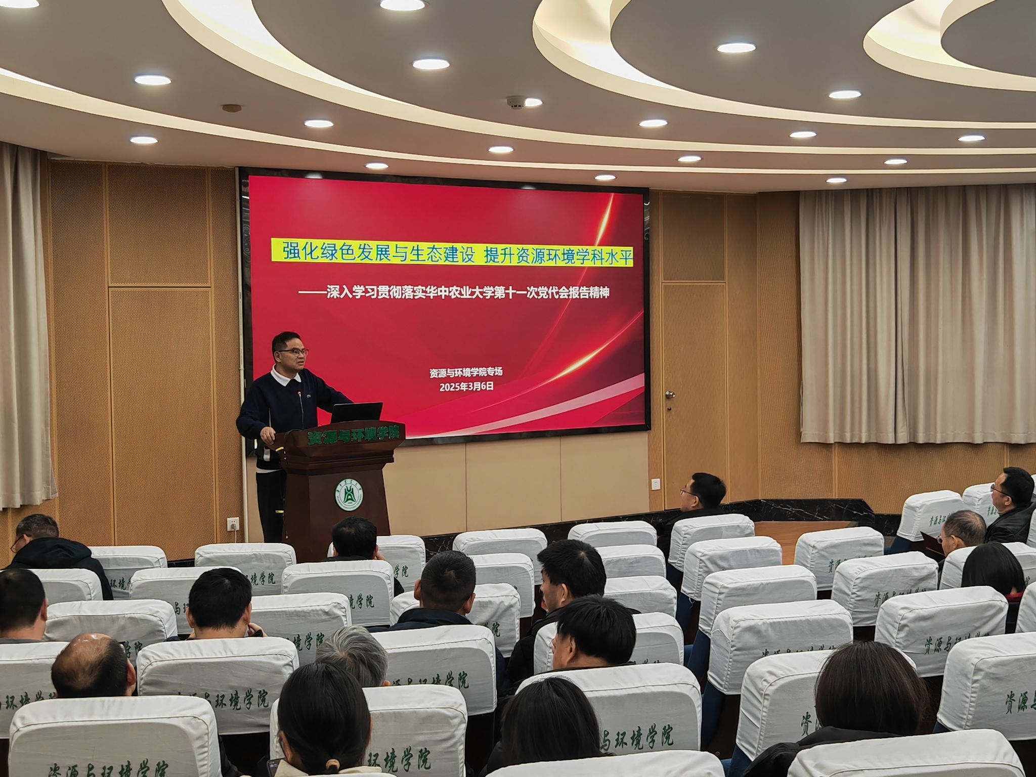 冯永平系统介绍了学校第十一次党代会报告的筹备工作及主要内容,并以历届党代会报告中关于资源环境学科的发展论述为切入点,深入解读了本次党代会报告的精神要义。