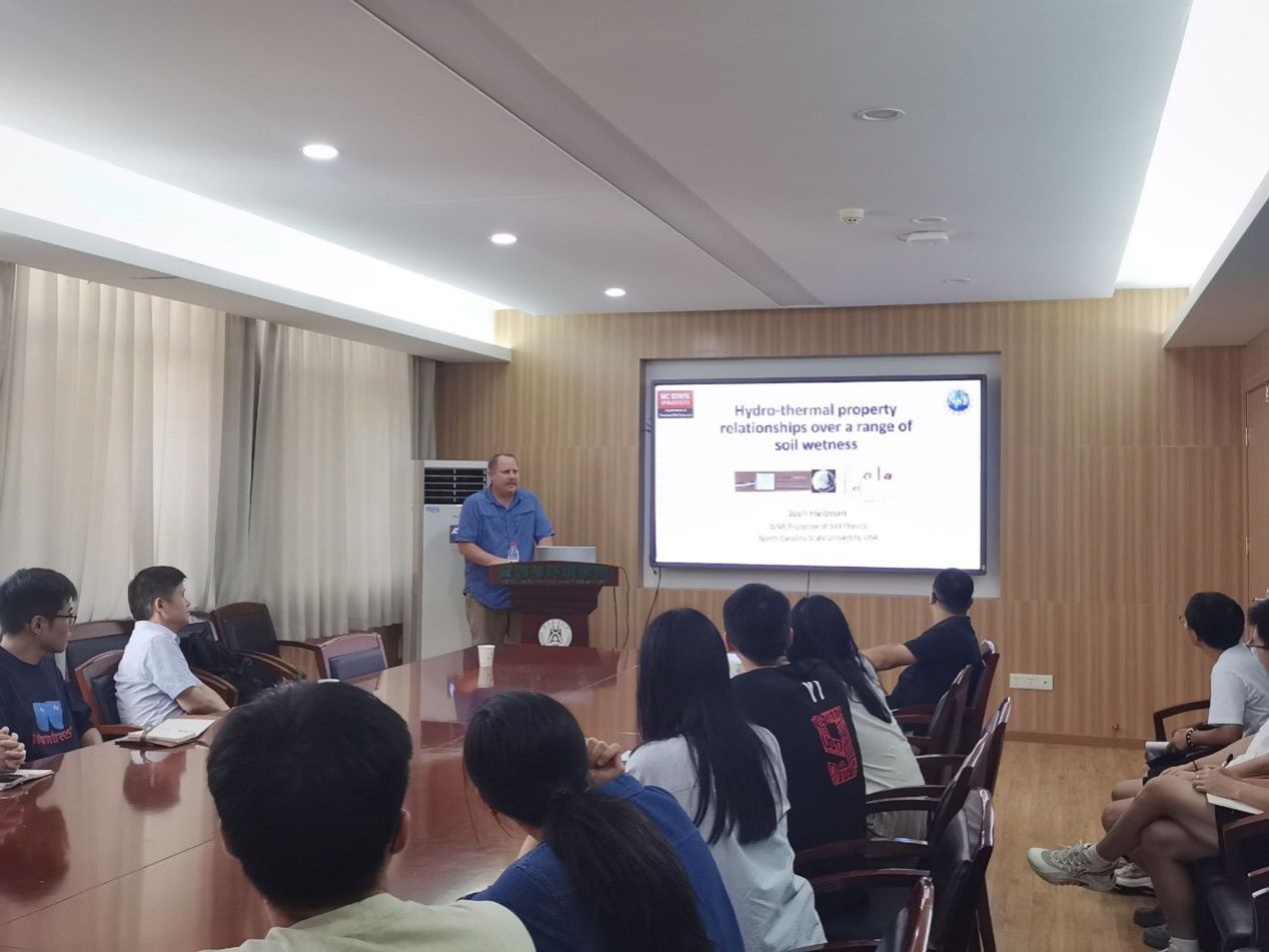 (通讯员 胡琴 潘明凯)8月14日-17日,应91直播 田正超老师邀请,美国北卡罗莱纳州立大学Josh Heitman教授访问91直播 ,与91直播 师生围绕“环境土壤物理学”领域开展深入学术交流。91直播 陈家宙教授、田正超副教授、魏玉杰副教授等接待了Heitman教授,91直播 近40余名师生以多种形式参与了此次学术交流活动。8月15日下午,Heitman教授做客91直播 “生态环境与绿色发展高端论坛”,在91直播 主楼315会议室作了题为“Hydro-Thermal Property Relationships Over A Range Of Wetness”的学术报告。Heitman教授详细阐述了土壤水热耦合特性在不同湿润条件下的变化规律,强调了这些关系在土壤物理学和陆面模式模型应用中的重要性。他团队的研究聚焦土壤水热特性与耕作改良、传感器技术的发展,提出了一系列创新方法来优化土壤管理实践。报告内容前沿且实用,使师生们对土壤水热相互作用的科学机制有了更深刻的理解。与会师生围绕土壤物理学和应用展开热烈讨论,Heitman教授耐心解答了师生提出的各类问题。访问期间,Heitman教授还参观了91直播 的水土保持研究中心及相关课题组实验室,详细听取了师生代表的科研工作汇报,并针对研究内容提供了宝贵建议,表达了深化双方合作、推动国际学术合作交流的强烈意愿。此次学术交流为91直播 师生提供了与国际顶尖学者对话的机会,通过与Heitman教授的深入互动,91直播 师生在环境土壤物理与水文学领域的科研视野得到了拓展,为未来高水平国际合作项目的开展奠定了坚实基础。