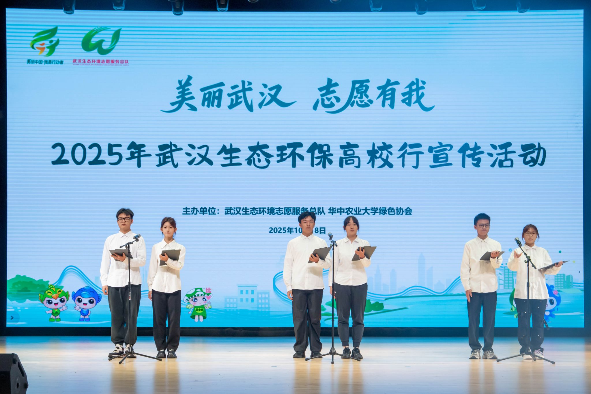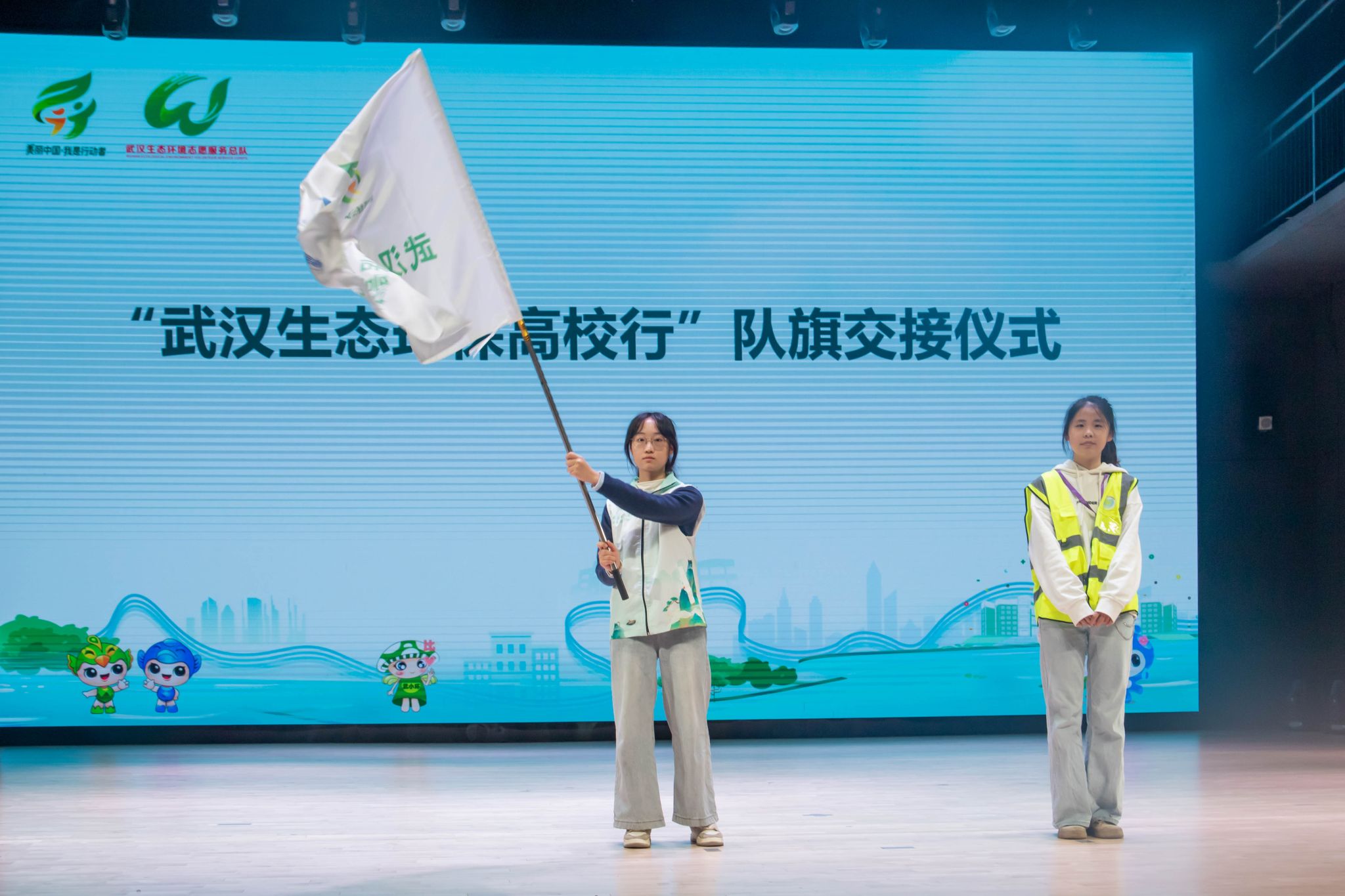 璀璨灯下,舞台之间,华中农大志愿者表演诗朗诵《美丽的江城河湖》,抒发对武汉河湖的深情礼赞。活动中,“武汉生态环保高校行”队旗交接到91直播 绿色协会执行会长王修函同学手中,象征着环保使命在高校间的持续传递。