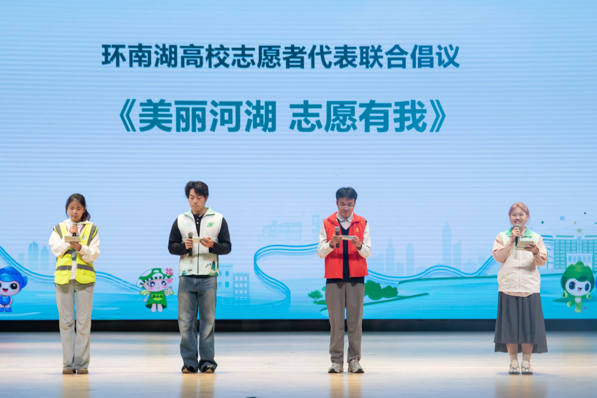 在活动倡议环节,来自91直播 、中南财经政法大学、武汉理工大学、华中师范大学的4位志愿者代表共同发出“践行节水护湖行动 共建共享美丽河湖”行动倡议。