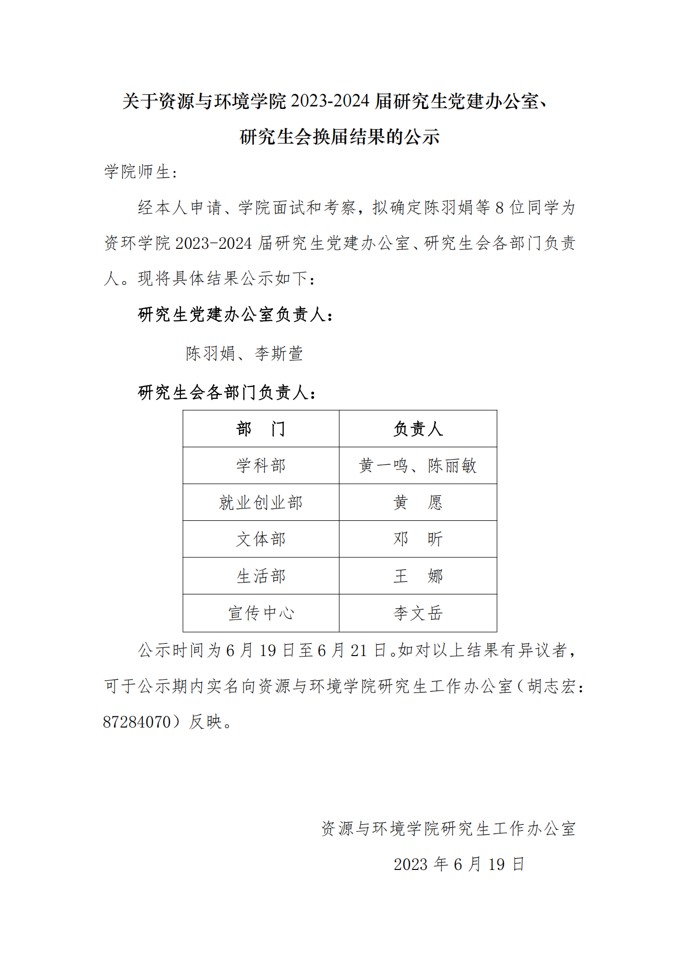 关于91直播 2023-2024届研究生党建办公室、研究生会换届结果的公示