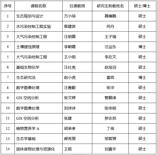 根据《91直播 研究生“三助一辅”实施办法》(校发[2023]157号)文件精神,经个人申请、导师和任课教师推荐、91直播 审核,拟聘用以下14名研究生担任2023-2024-2学期《生态规划与设计》等本科生课程助教,现予以公示。