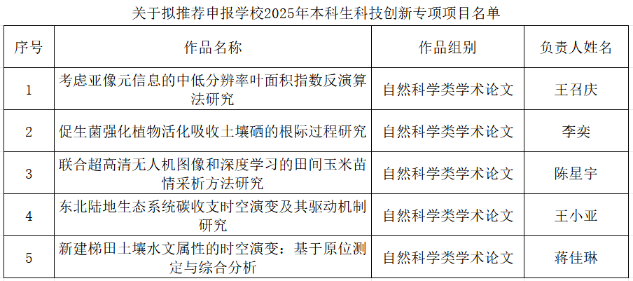 根据《关于开展2025年本科生科技创新专项申报工作的通知》要求,经过学生申报、91直播 评审等环节,拟推荐《考虑亚像元信息的中低分辨率叶面积指数反演算法研究》等5个项目申报学校2025年本科生科技创新专项。