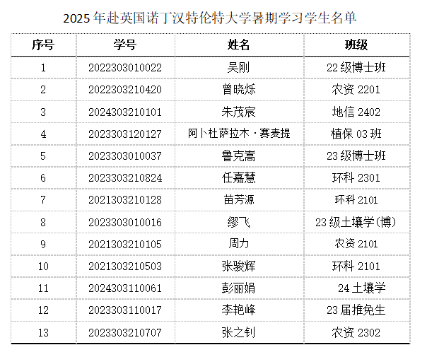 按照91直播 2025年遴选学生赴英国诺丁汉特伦特大学暑期学习报名通知要求,经学生自主申请、91直播 资格审核、面试考核,拟录取吴刚等13名同学,现将名单公布如下: