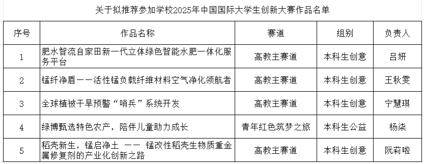根据《关于举办2025年中国国际大学生创新大赛91直播 选拔的通知》要求,经过学生申报、91直播 评审等环节,拟推荐《肥水智流自家田新一代立体绿色智能水肥一体化服务平台》等5件作品参加学校2025年中国国际大学生创新大赛。