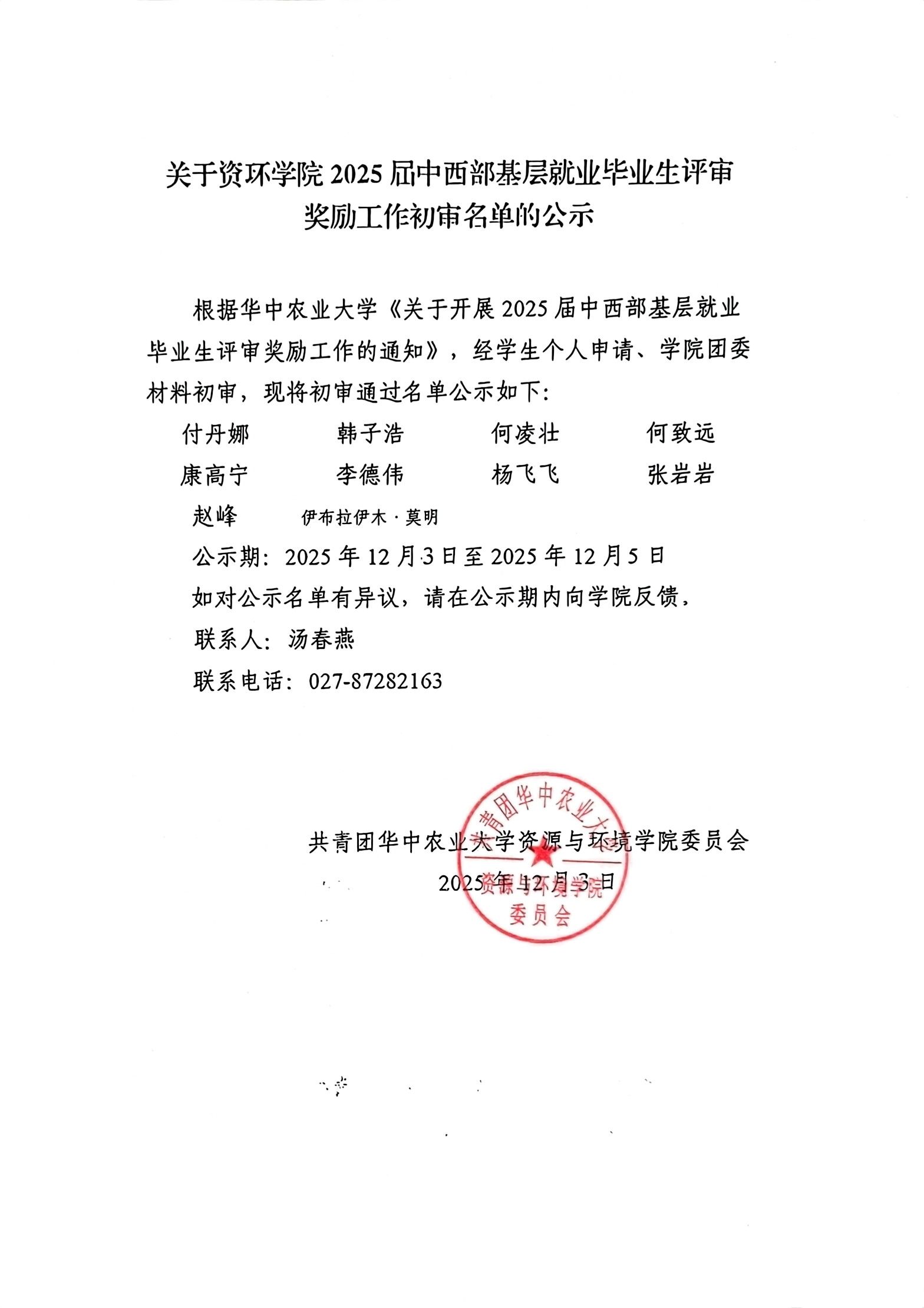 关于91直播 91直播 2025届中西部基层就业毕业生评审奖励工作初审名单的公示