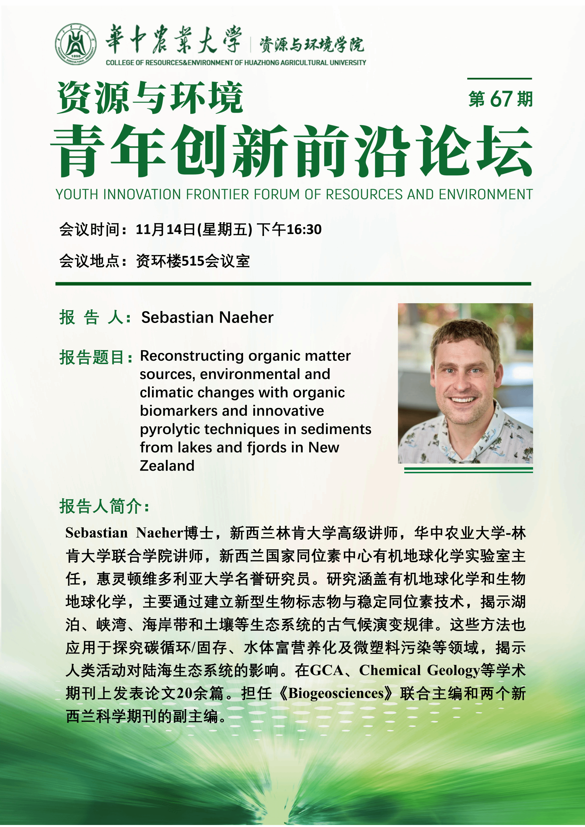 【青年创新前沿论坛】第67期:Reconstructing organic matter sources, environmental and climatic changes with organic biomarkers and innovative pyrolytic techniques in sediments from lakes and fjords in New Zealand