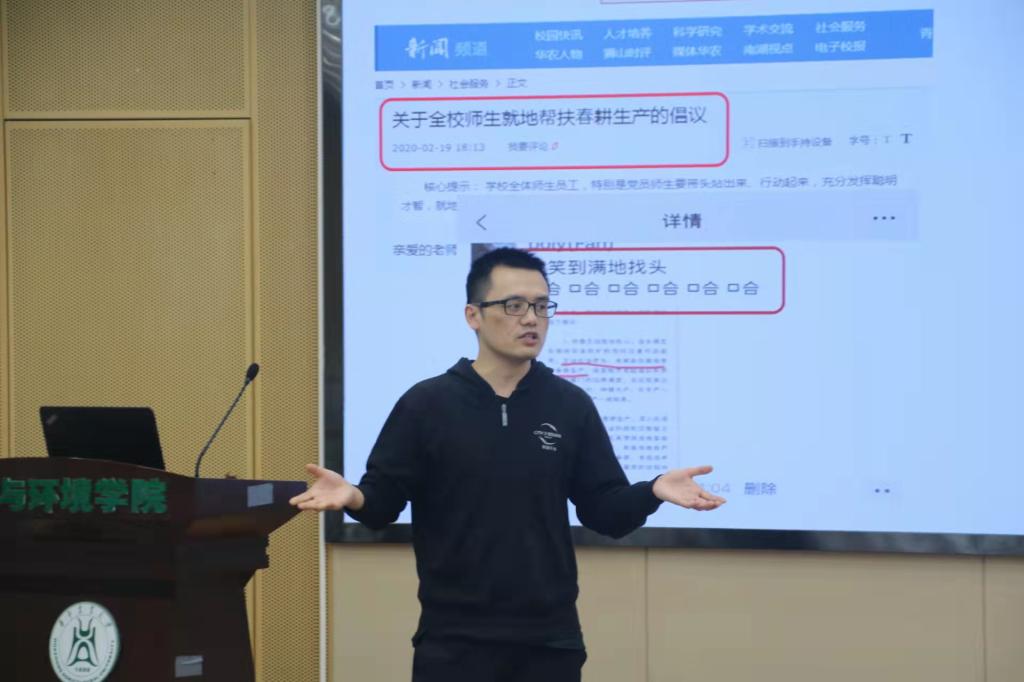 “还记得那份《关于全校师生就地帮扶春耕生产的倡议》吗?”刘新伟以疫情防控和春耕生产重要时节,91直播 师生就地依法科学有序帮扶春耕备耕的事例为引,展开了“农业科技知识、智力优势与专业实践相结合”的话题,他谈到:“有同学觉得,一线生产离我们还很遥远,也有同学觉得,自己之所学难以指导生产一线,但实际上,我们的书本知识、科学研究都是在为解决实际问题奠定基石,广袤的农村也亟需大批农业科技人才提供智力支持。”