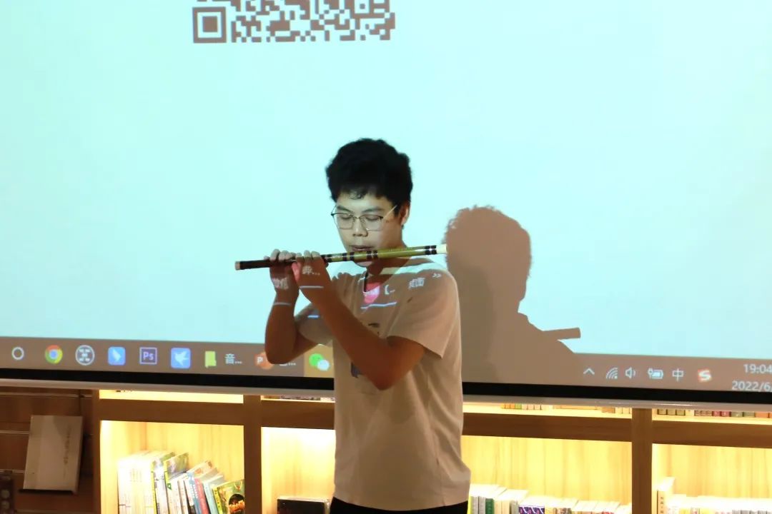 心弦民乐团竹笛声的任天放同学第一位进行分享,他以一曲清朗欢快笛乐拉开了我们此次分享的帷幕。他用诙谐幽默的语言介绍了在民乐团竹笛学习中的故事,引起了现场观众的阵阵笑声。“笛声三弄,梅心惊破”一首《望乡》勾起了在座同学的思乡之情。“这是一个不停学习、磨炼的过程,但我会一直坚持,变得更加优秀”任天放以这样一句话总结了自己在竹笛学习中的体会和感受。