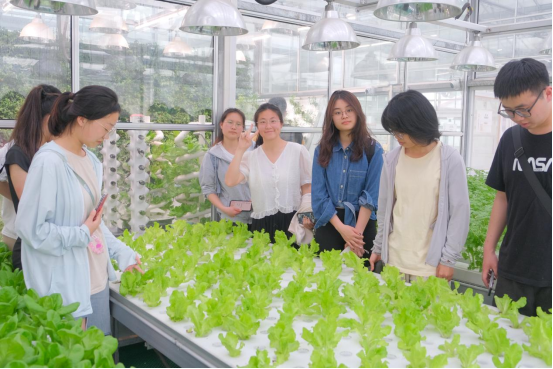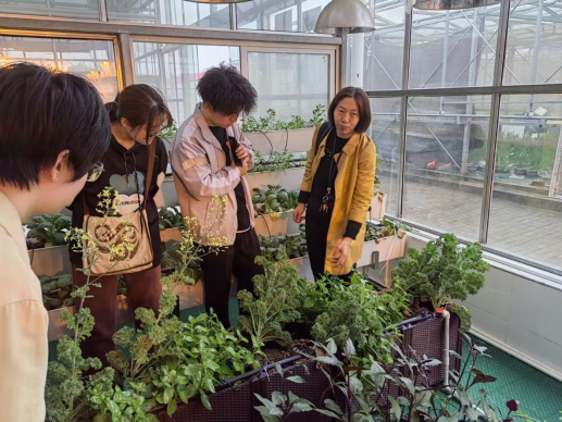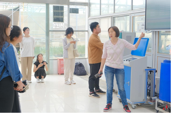 除了对智能水肥一体化设备与技术的介绍,郭再华老师还带领同学们参观了智能温室无土栽培,该温室配备了控温、补光、通风等设施,可以通过传感器、物联网和智能控制系统实现温室环境(温度、湿度、光照等)的监测和智能调控,维持作物优质高产的适宜生长环境。例如,根据作物类型设定适宜的生长温度范围,当温度过高时,智能控制系统会自动启动降温设备,当温度过低时,则会启动加热设备,直到环境温度达到设定温度范围设备自动停止运行,以此保持作物适宜的生长温度。