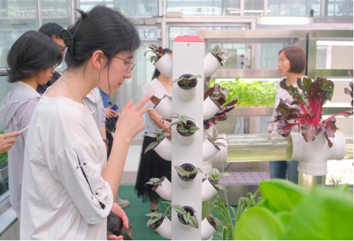 在参观中,同学们被温室内现代化的立体水培所吸引,立体水培是通过立体装置充分利用空间,将植物的部分根系浸泡在营养液中,吸收的养分齐全、均衡,生长环境清洁无污染,是生产优质高端蔬菜的最佳技术。智能水肥一体化系统让规模化立体水培更节本、高效、便捷。
