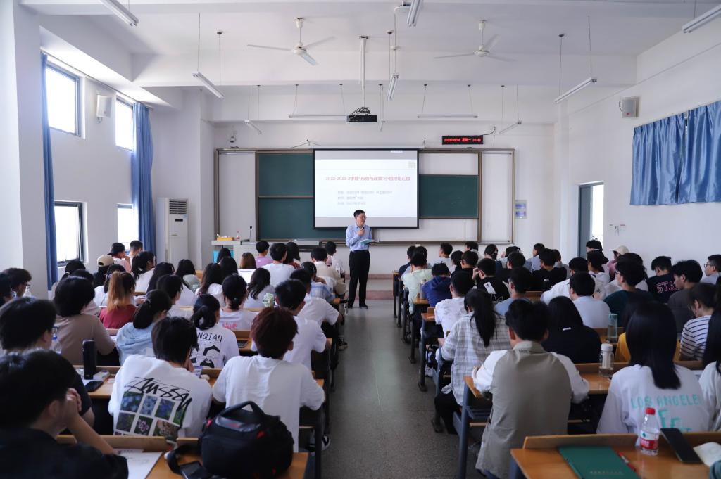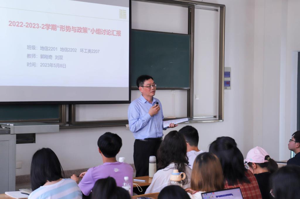 5月8日下午,校党委常委、副校长郭刚奇在第四教学楼A203教室为91直播 地信2201班、地信2202班及环工类2207班讲授《形势与政策》课程,马克思主义91直播 副教授刘双老师主持课堂。