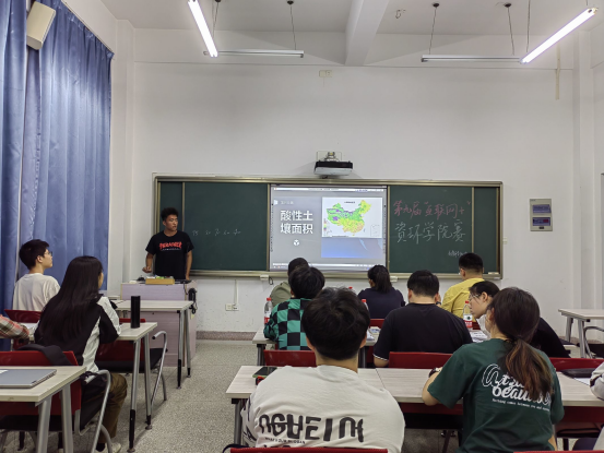 环工类2202班王思涵以蚯蚓土壤酸碱剂的研制与产业销售为题进行项目汇报,首先介绍了我国的土壤酸碱化面积,并突出其危害。接下来介绍其团队产品,利用蚯蚓粪与蚯蚓土壤组成的有机生物肥料降低土壤的碱度,同时富含多种微生物菌种,促进植物生长,用新时代的科技手段,神产出绿色高效的土壤调节剂,且价格低廉,市场前景广阔。