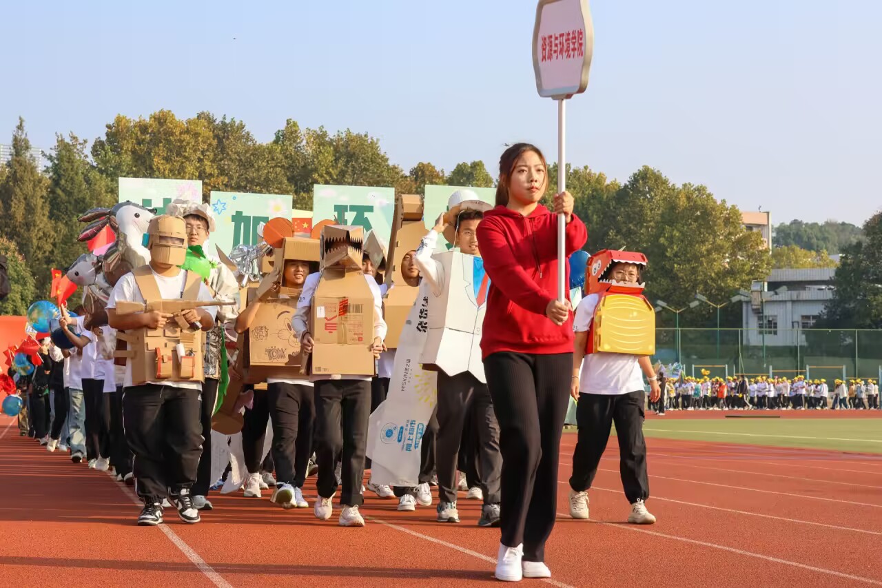 开幕式方阵最大的亮点是将废旧纸箱进行创意利用,有趣又有力地展示了91直播 学子将环保理念应用于具体生活的生动实践,守护绿水青山,合理利用资源,91直播 学子永远在路上。