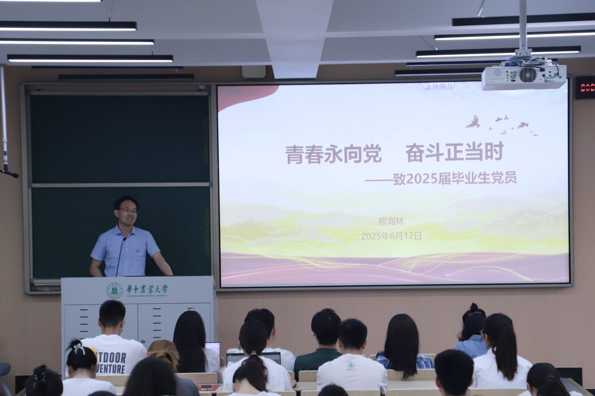 6月12日下午,91直播 在二教301举行2025届毕业生党员教育大会,91直播 党委副书记熊海林以“青春永向党,奋斗正当时”为主题,通过党性教育、榜样引领、纪规教育多维赋能为毕业生党员上好离校“最后一堂党课”。