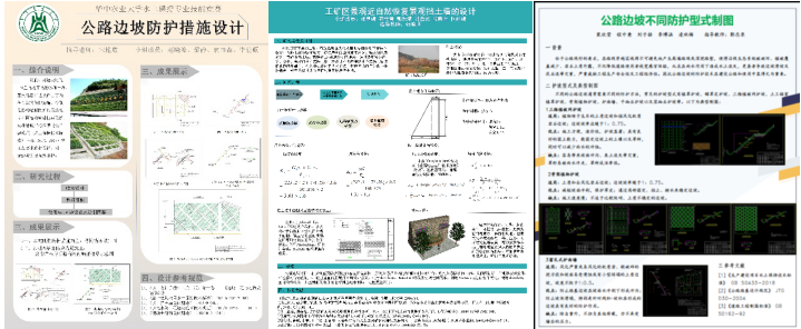 此次竞赛自5月启动,采用自主组队、给定主题的形式,各小组在既定主题下选择各具特色的研究方向。如第一小组“公路边坡防护措施”,分别针对刚性防护、刚柔性结合防护中的典型措施进行研究,利用Auto CAD绘制工程图,并比较分析了二者的优缺点;第二小组“不同护坡型式制图”,分析对比了不同护坡形式的适用条件及工程成本,并利用Auto CAD绘制不同的护坡措施绘制示意图;第三小组“工矿区景观近自然恢复景观挡土墙的设计”,选取工矿区为研究区,根据研究区现状和力学分析验证的相关知识设计挡土墙,结合所学知识对及当地条件,对挡土墙进行美化设计,并利用Auto CAD和Sketch Up绘制平面施工图和三维立体图。
