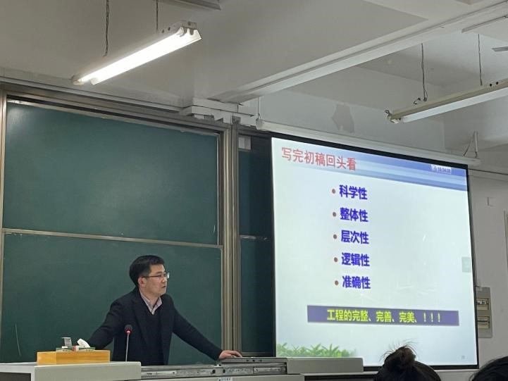 随后,赵老师从组成论文的封面、扉页、独创性申明及使用权书、目录、中英文摘要、缩略表、正文、参考文献、附录、致谢10个部分全方位细致讲解每一部分的内容、格式及注意事项。同时提醒同学们在写完初稿以后应当反复检查修改,确保论文的完整、完善和完美。最后,赵老师为全体毕业生送去了祝福:“心若在,梦就在,希望同学们都能写出优秀的毕业论文。”