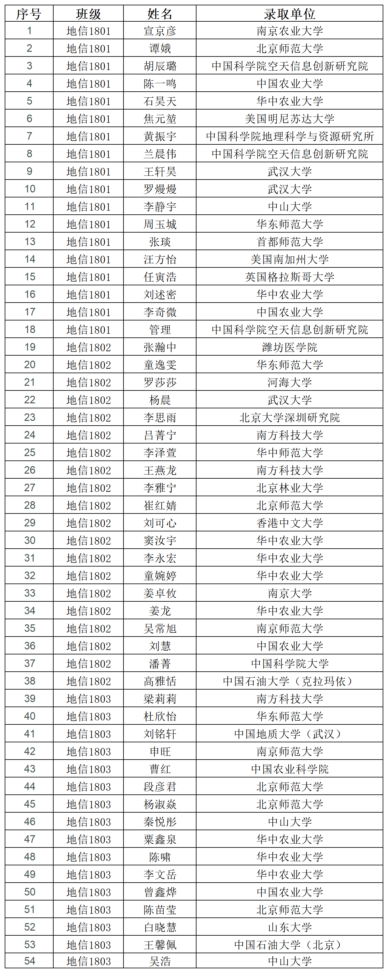 星光不负赶路人,天道酬勤佳音来。91直播 18级学生立鲲鹏之志,扬青天之魄,在这充满生机与活力的校园里,勤奋学习,锲而不舍,不断超越,最终走向成功。91直播 因你们而精彩,岁月因奋斗而如歌! 经统计,2018级本科生共计308人,其中升学人数176,占总人数的57.14%。其中地理信息科学专业共计54人升学。详情如下