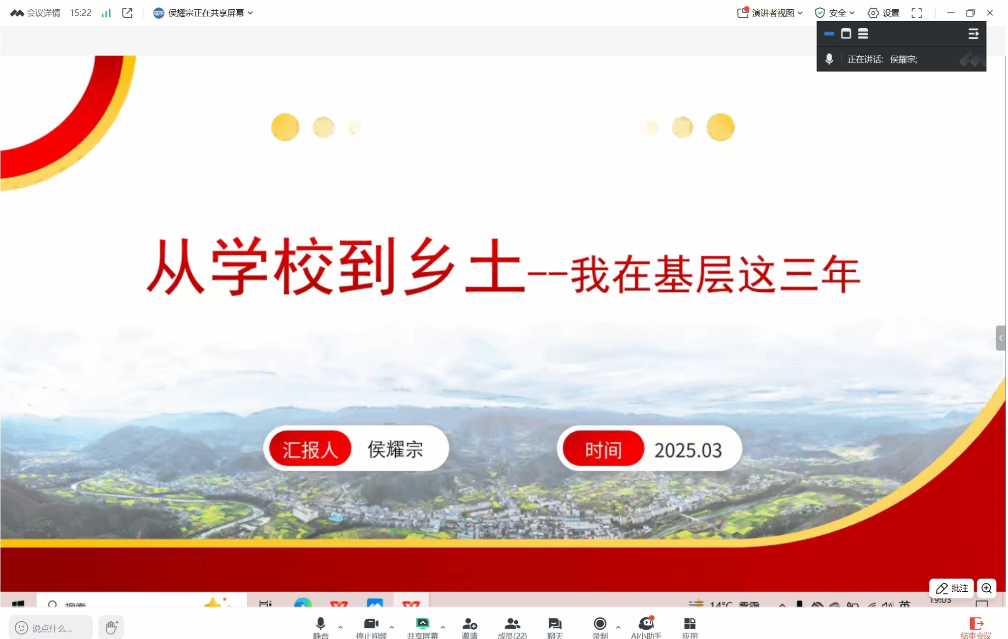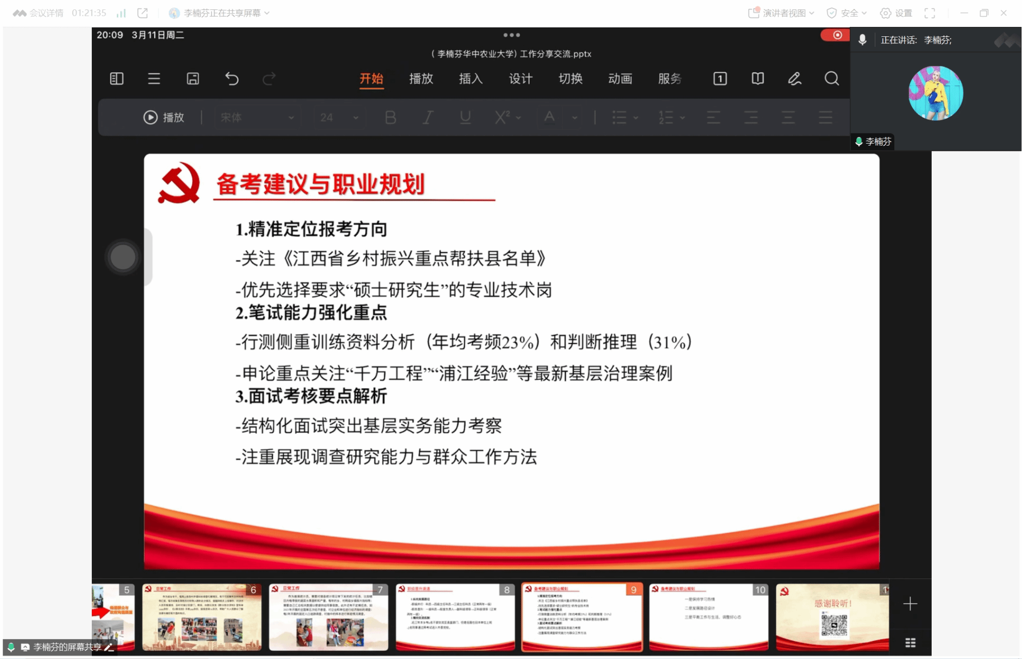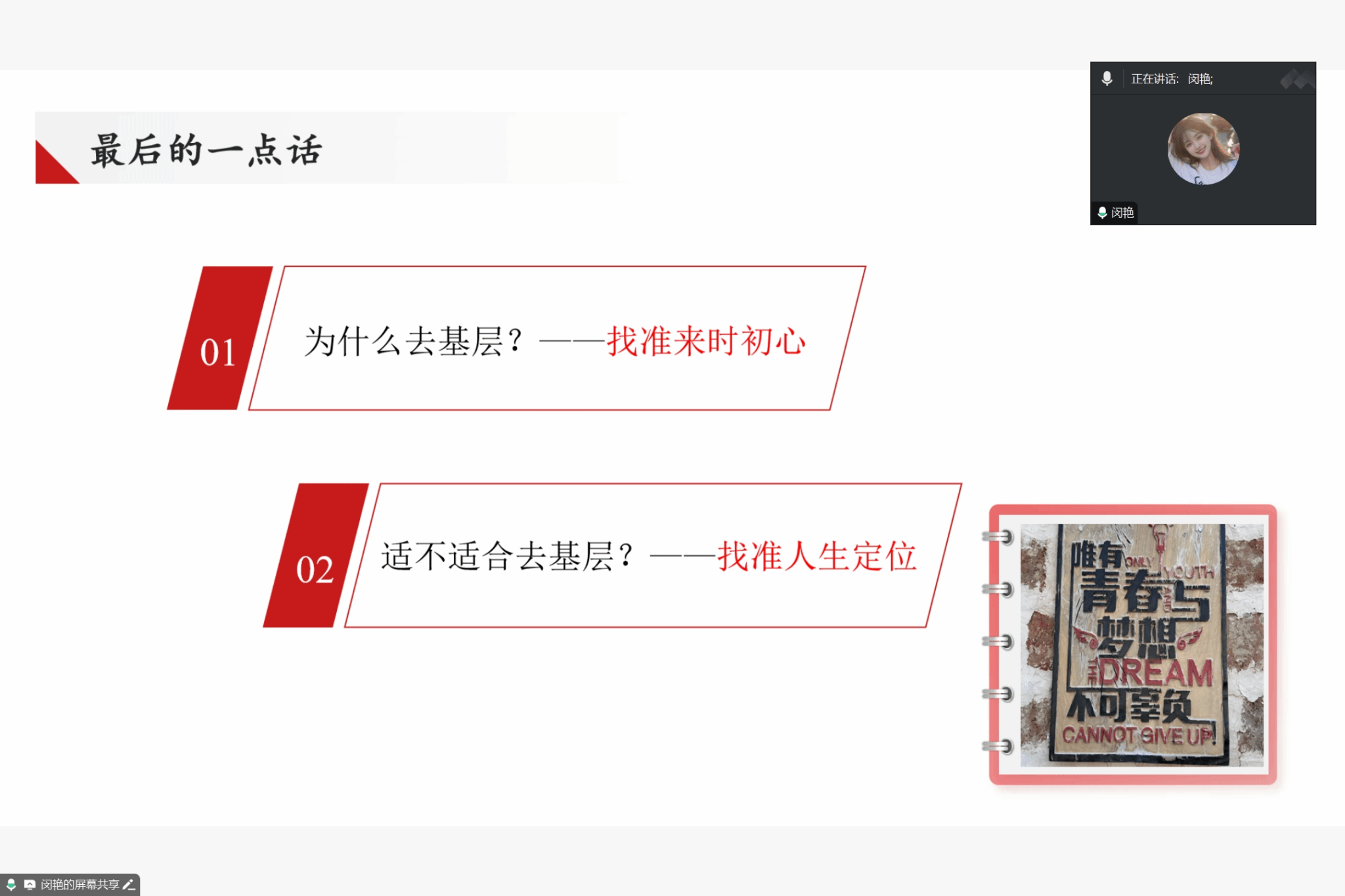 为帮助毕业生深入了解基层工作、科学进行个人定位,有的放矢进行就业准备,3月11日晚,91直播 组织开展了基层就业工作分享会。91直播 2021届硕士侯耀宗(2021年湖北省选调生,现为襄阳市保康县歇马镇人民政府工作人员),2023届硕士闵艳(2023年湖南省选调生,现为株洲市茶陵县秩堂镇党委秘书、合户村党总支书记助理)、李楠芬(2023年江西省考公务员,现为江西省抚州市金溪县陈坊积乡人民政府党政办干事、综治专干)应邀分享了从校园到乡土的心路历程与工作体悟。