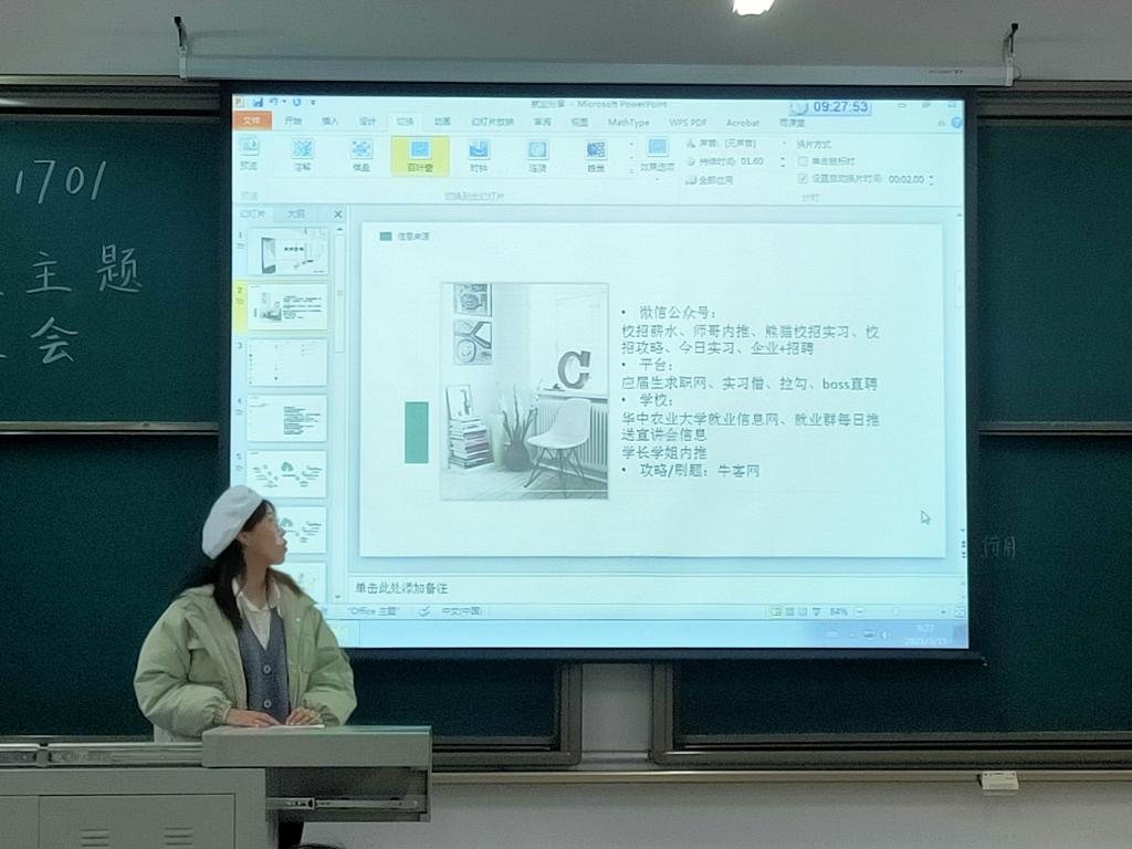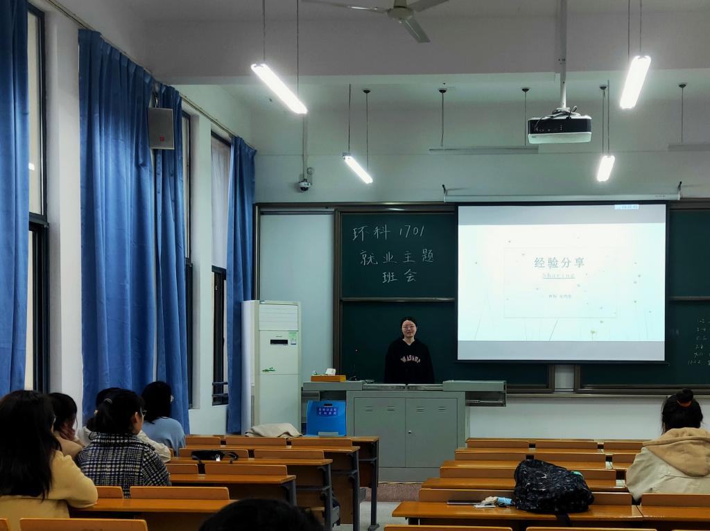 经验分享环节分为求职经验分享和升学经验分享。本次班会特别邀请了地信1703班的叶璐晨同学进行了求职经验分享,叶璐晨同学根据自己的求职经历,梳理了求职的具体流程,并从自我认识、信息收集、简历制作、能力提升、面试等多个方面详细分享了她的求职经验。她提到,求职路上一定要学会如何展现自我,自信是求职不可缺少的一环,要把自己的才华和独特的风采展现给别人看。